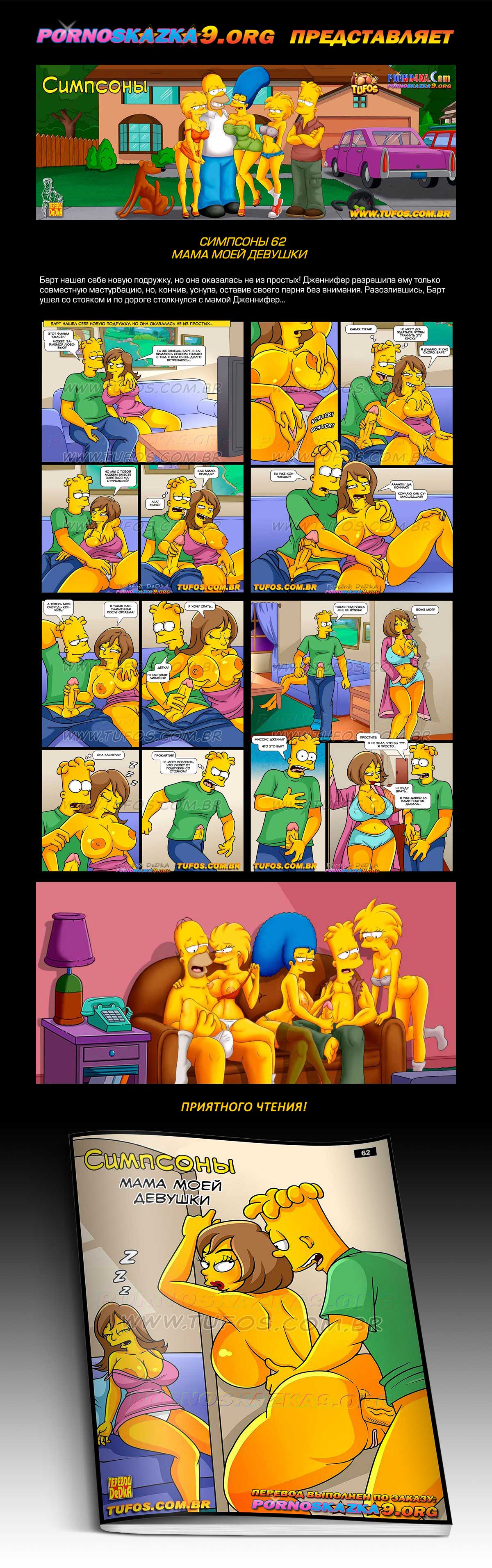 Порно комикс «Симпсоны. Часть 62. Мама моей девушки.» Барт нашел себе новую подружку, но она оказалась не из простых! Дженнифер разрешила ему только совместную мастурбацию, но, кончив, уснула, оставив своего парня без внимания. Разозлившись, Барт ушел со стояком и по дороге столкнулся с мамой Дженнифер…